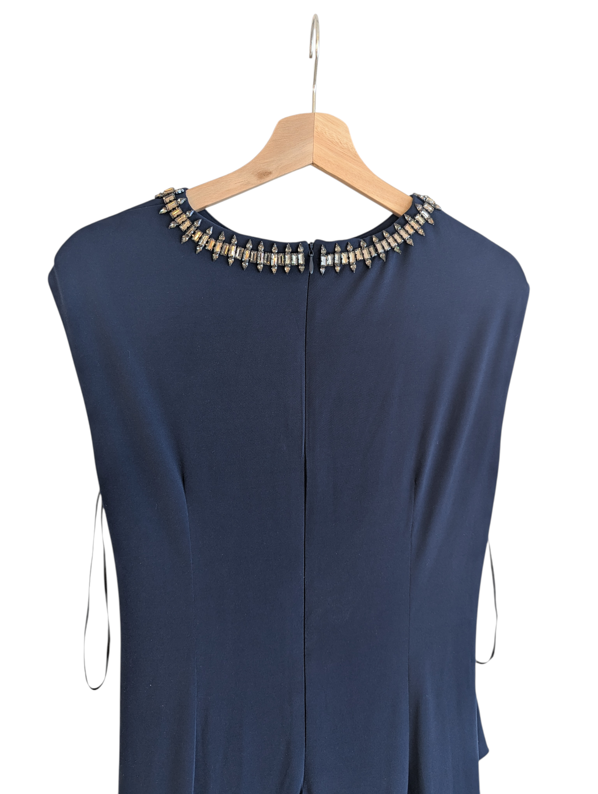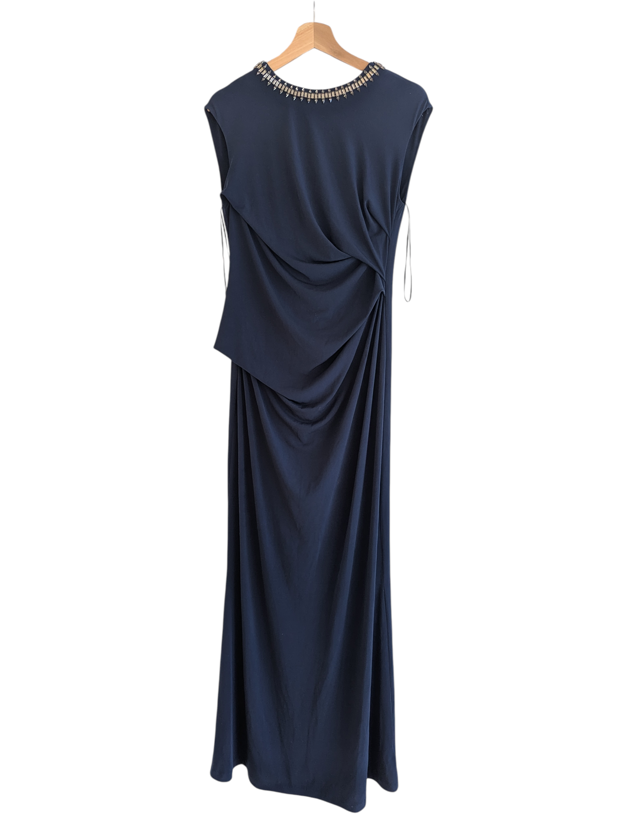 This is a genuine A Pea In The Pod maternity gown featuring an elegant embellished neckline, flattering ruched sides and a long, draped silhouette. Designed for comfort and style, this navy gown is perfect for formal events, weddings, or special occasions, providing room for a growing bump while maintaining a sophisticated look.