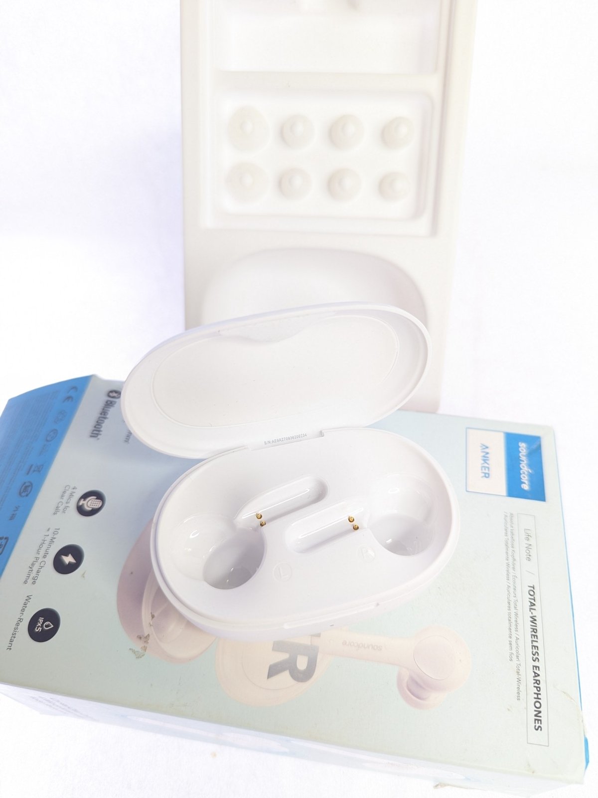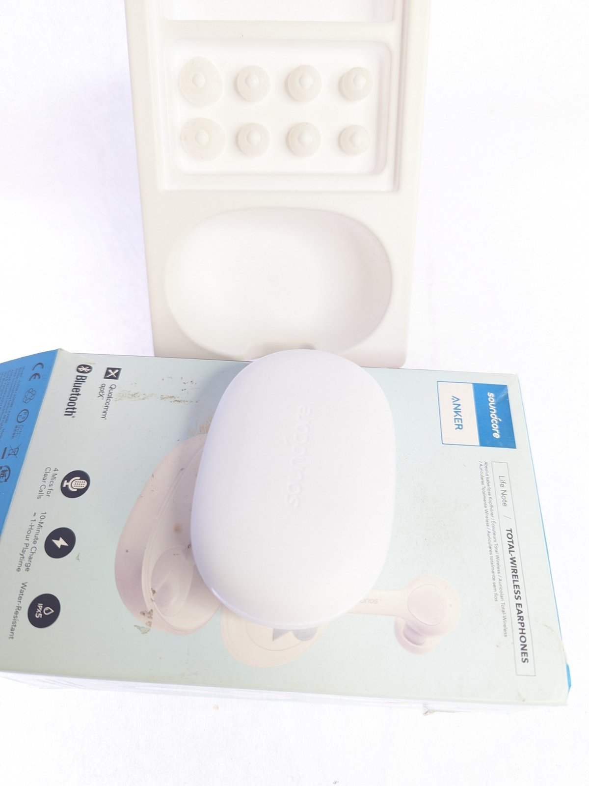 Anker A3908-White Life Note TWS Headphones, White – NO EARBUDS Anker A3908-White Life Note TWS Headphones, White – NO EARBUDS is a Certified Pre-Owned Item in Like New Condition. CHARGING CASE ONLY. NO EARBUDS. Includes: CHARGING CASE ONLY. NO EARBUDS. Retail box.