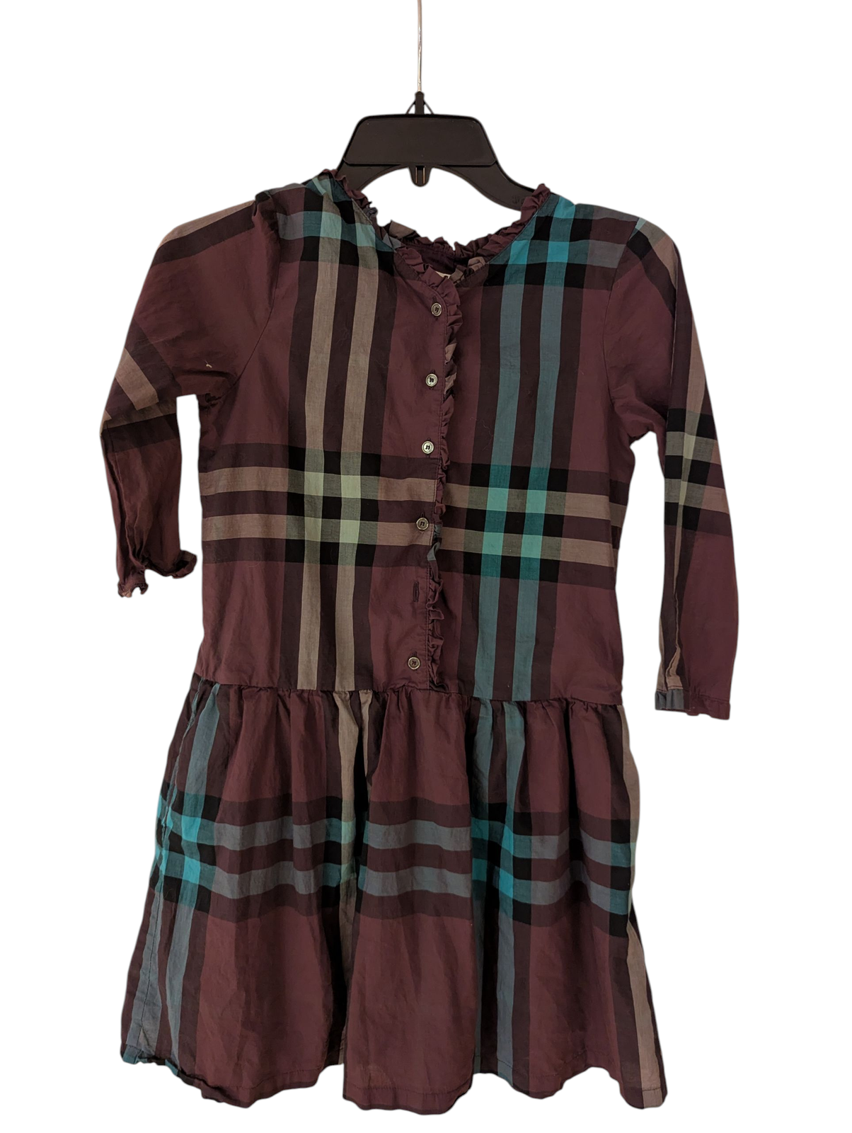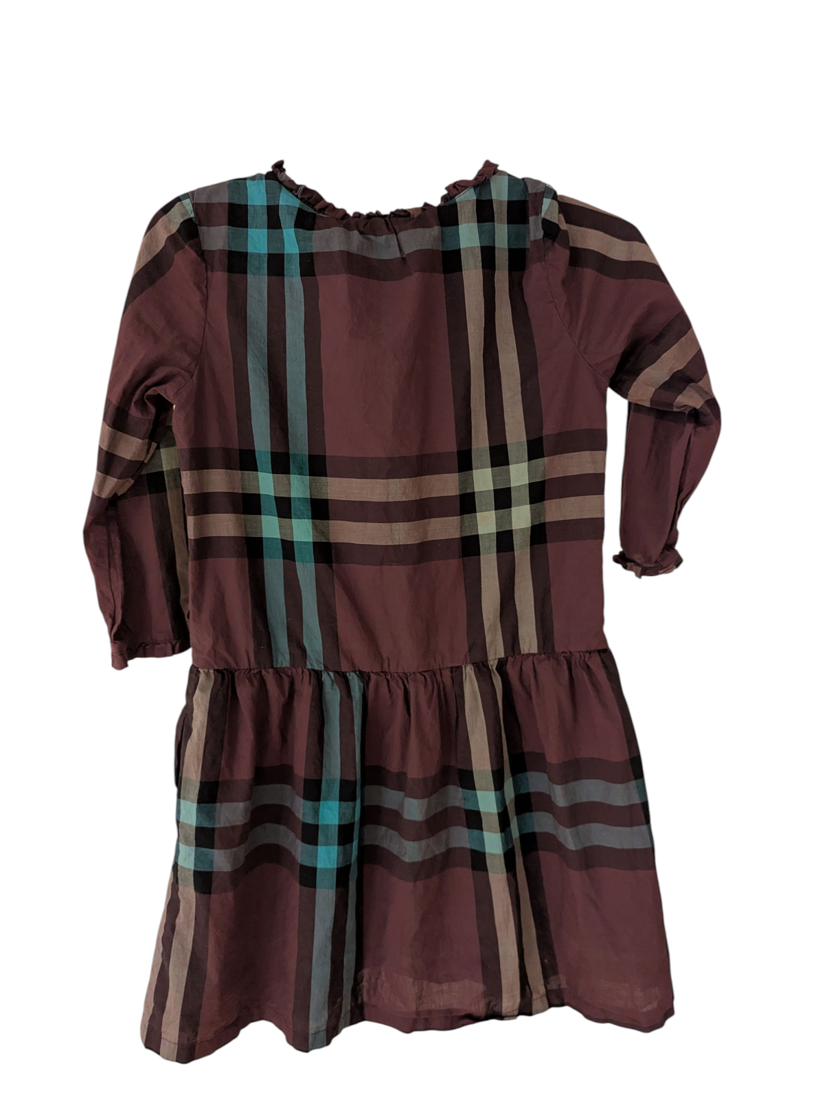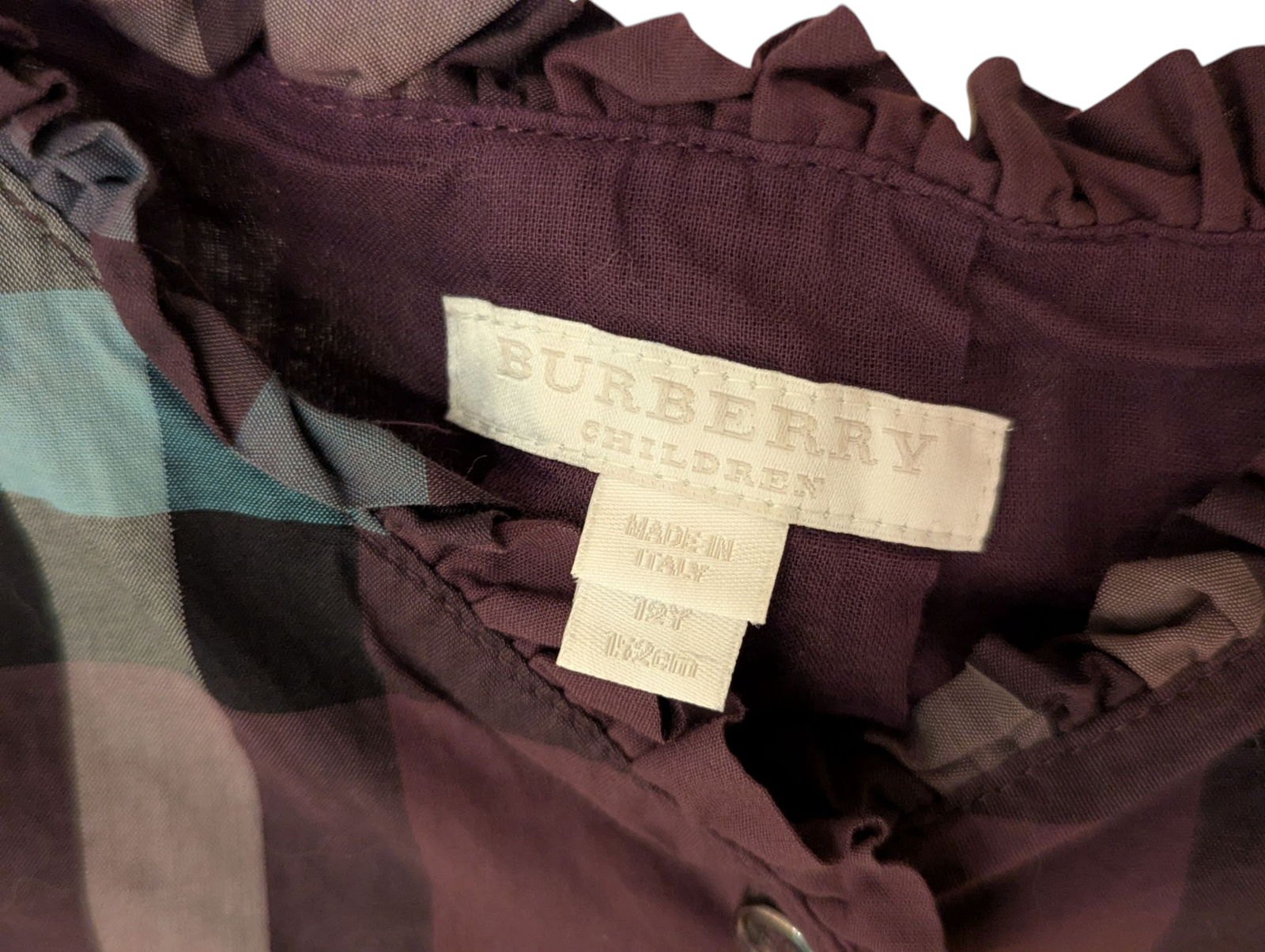 Brand: Burberry Children Size: 12Y (fits height 152 cm) Material: Soft cotton blend Pattern: Classic Burberry Nova Check plaid Design: Ruffle collar, long sleeves, tiered skirt Country of Manufacture: Italy