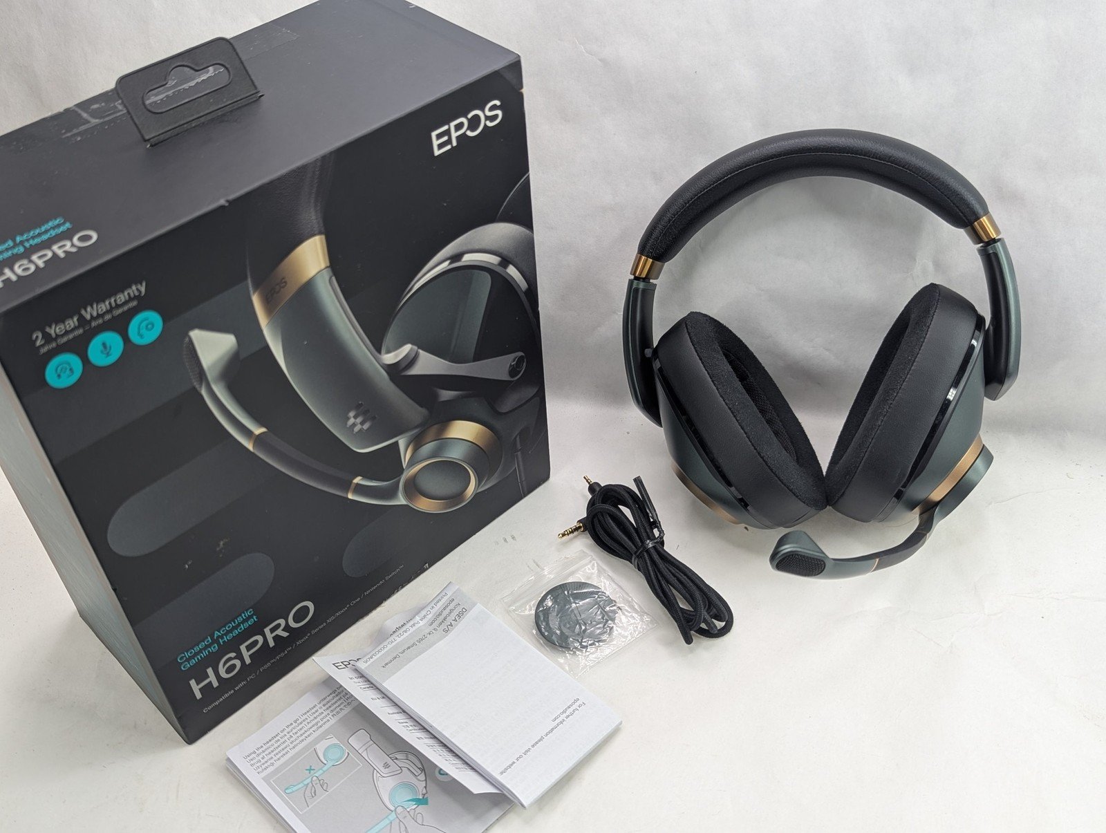 1x EPOS H6PRO Closed Acoustic Gaming Headset 1x Audio Cable (3.5mm) 1x Magnetic Boom Microphone 1x Metal Side Cover (for mic port) 1x User Documentation