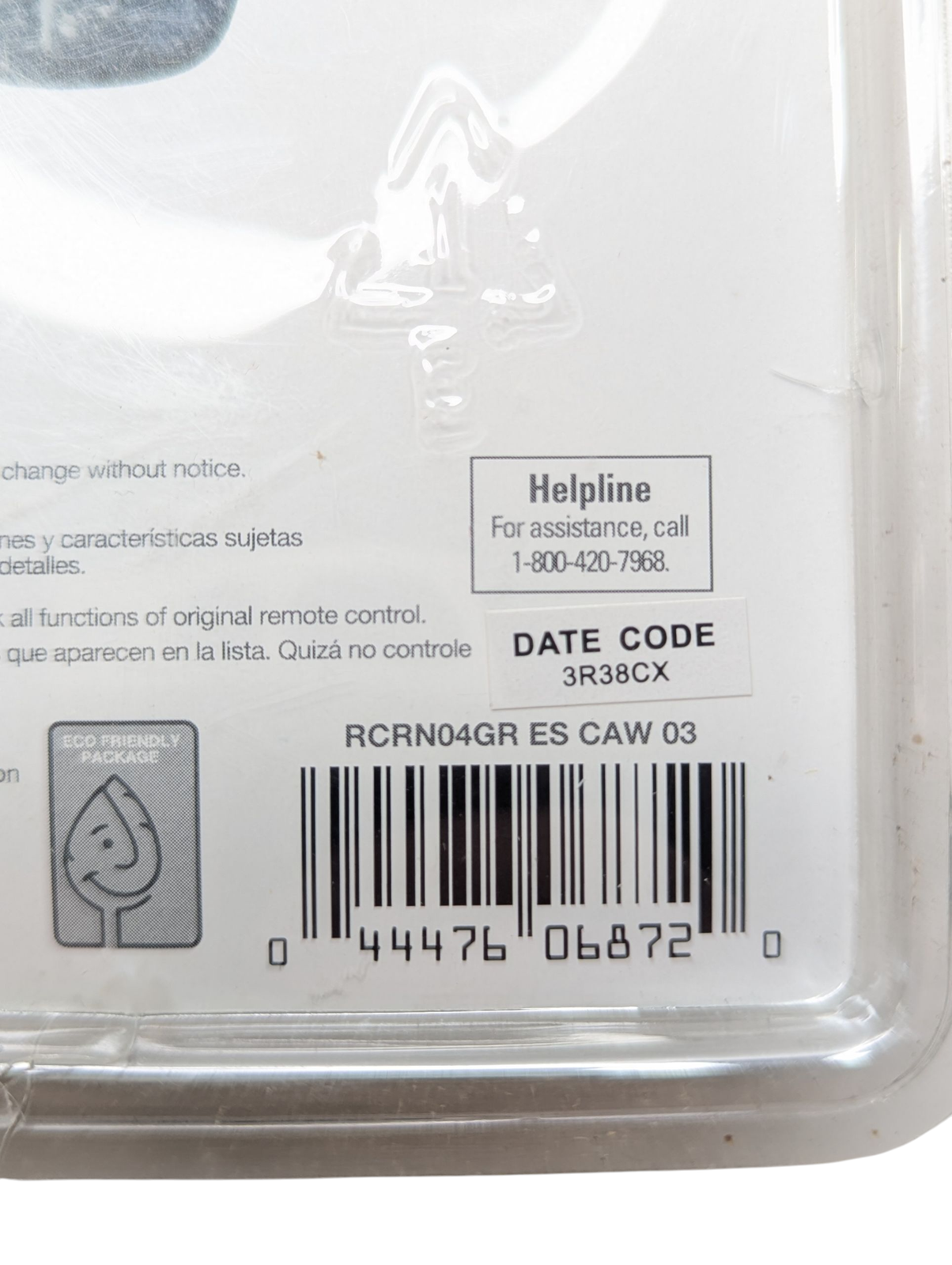 One (1) RCA RCRN04GR Universal Remote Control in retail packagingNOTE: Original user manual and batteries may not be included.