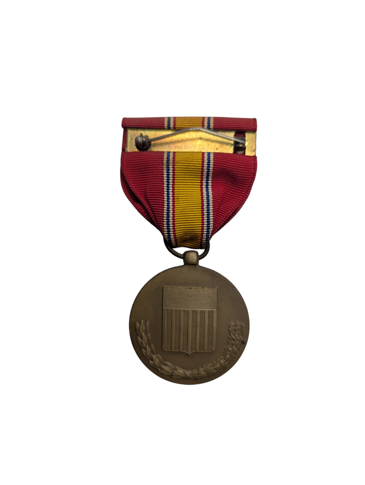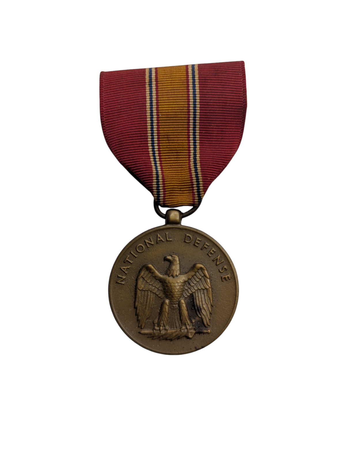 This listing is for an authentic USGI National Defense Service Medal (NDSM) set including the full size medal and ribbon bar, NSN 8455-00-281-3214. The medal features the classic eagle and shield design, with the red-white-yellow ribbon. Ideal for collectors, reenactors, or as a replacement for a lost/damaged set.